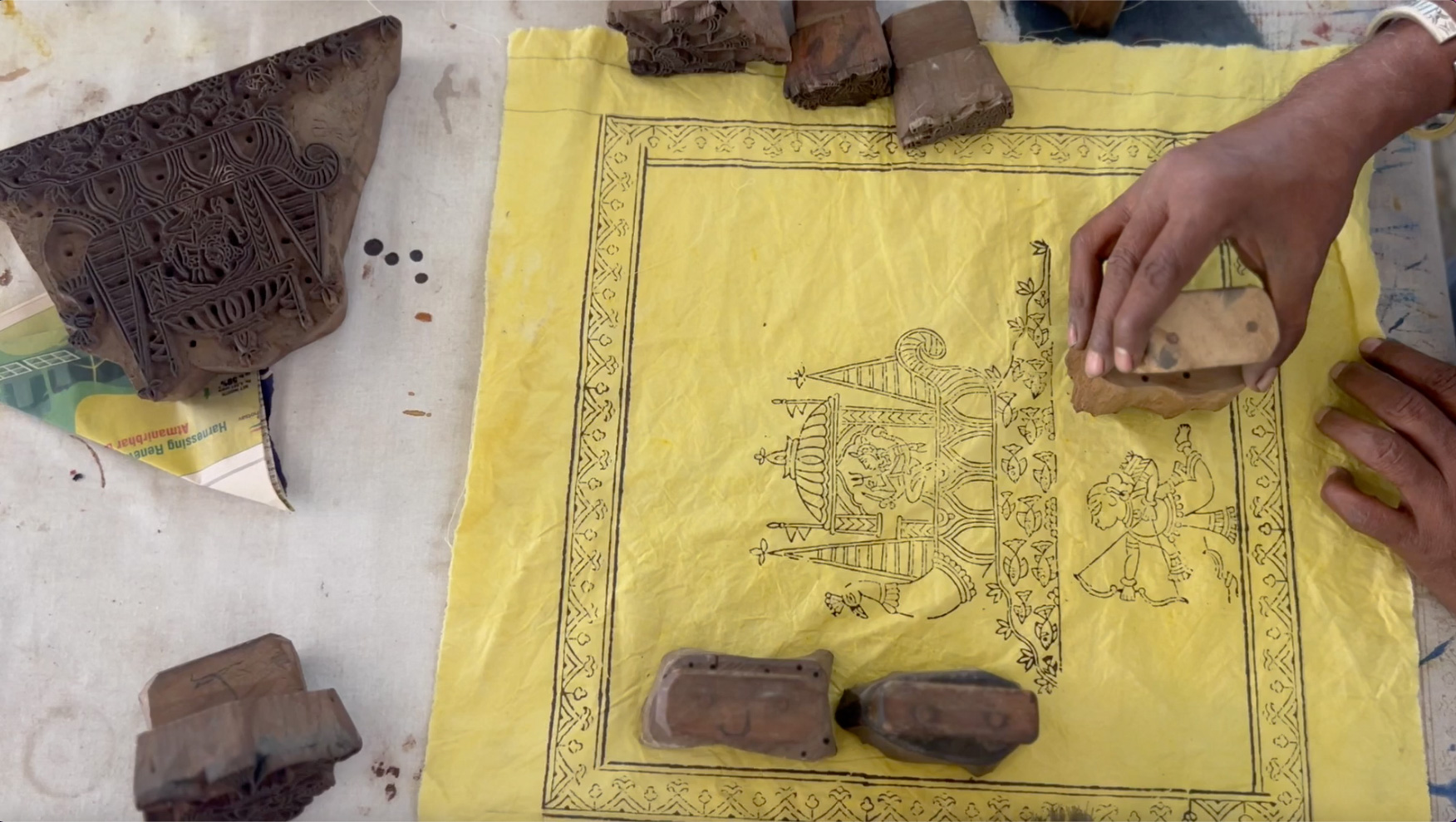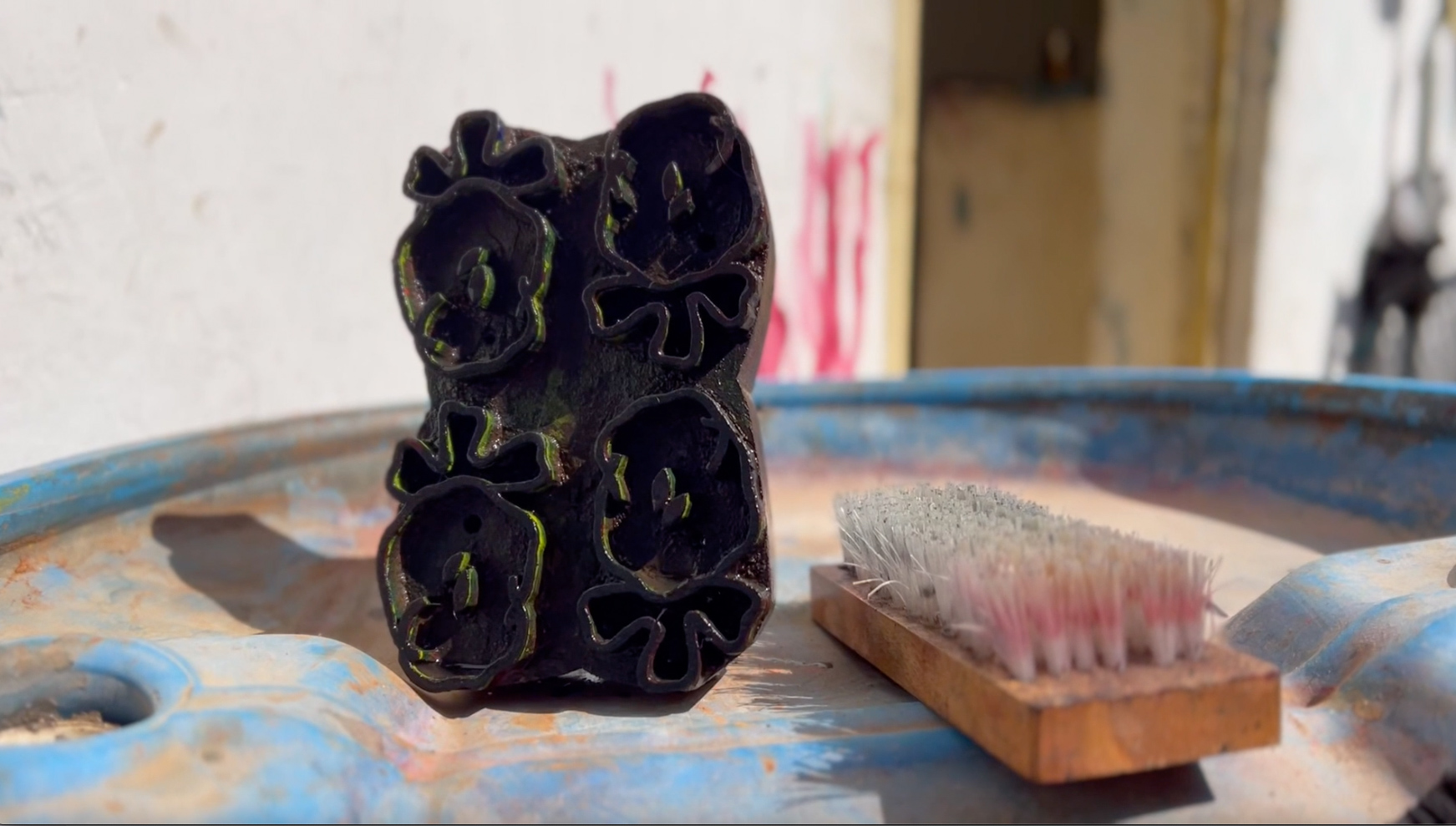 Jayanti Bhai washes wooden blocks after use.
