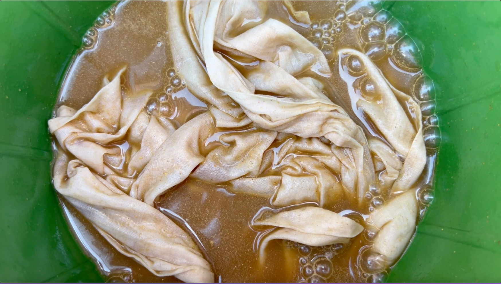 Jayanti Bhai mordating the fabric by dissolving harda powder (Terminalia chebula) in lukewarm water and soaking the fabric in the solution for about twenty minutes. The fabric is put to dry in the sun for about three days, as the sun light acts as a fixing agent together with harda, allowing the fibers to receive and fixate other vegetable and mineral dyes.