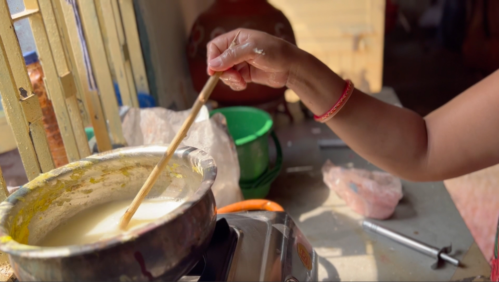 Kirit and Usa preparing red mineral paint from alum. Firstly, crushing alum rock with a hammer into powder, then collecting the powder into a boiling water pot to be simmered for one hour.