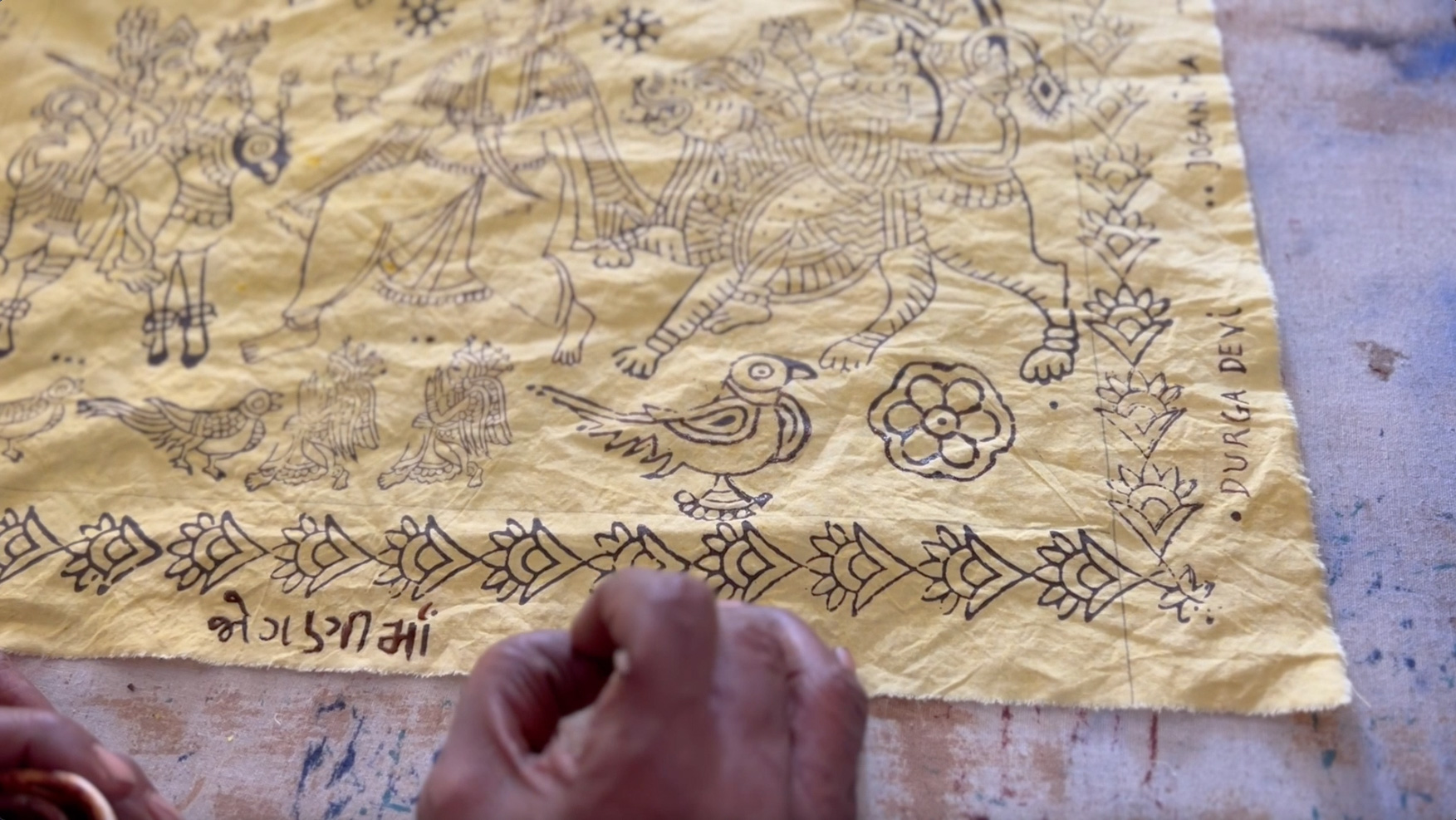 Jayanti Bhai and Kirit draw the outlines in the pre mordated cloth with the qalam using black paint. The kalamkari starts.